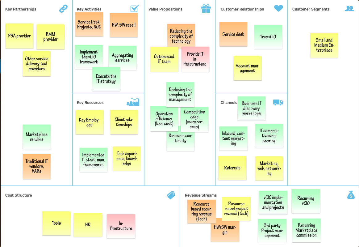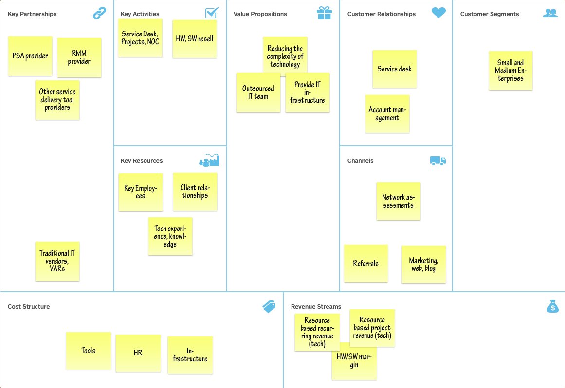 Key resources are those that if taken away bring the company to a stop. For MSPs, the key resources are the human capital, client contracts, relationships, and experience and knowledge base of service delivery.Key Partnerships: